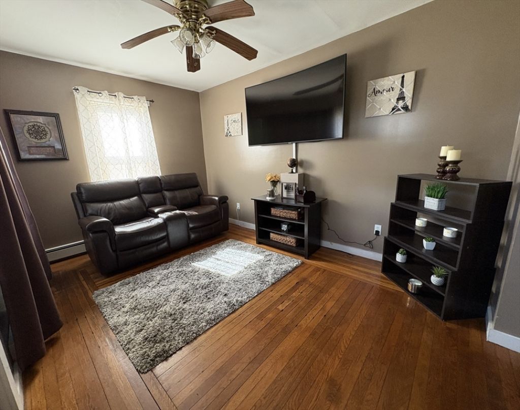Living Room: Ceiling Fan(s), Flooring - Hardwood